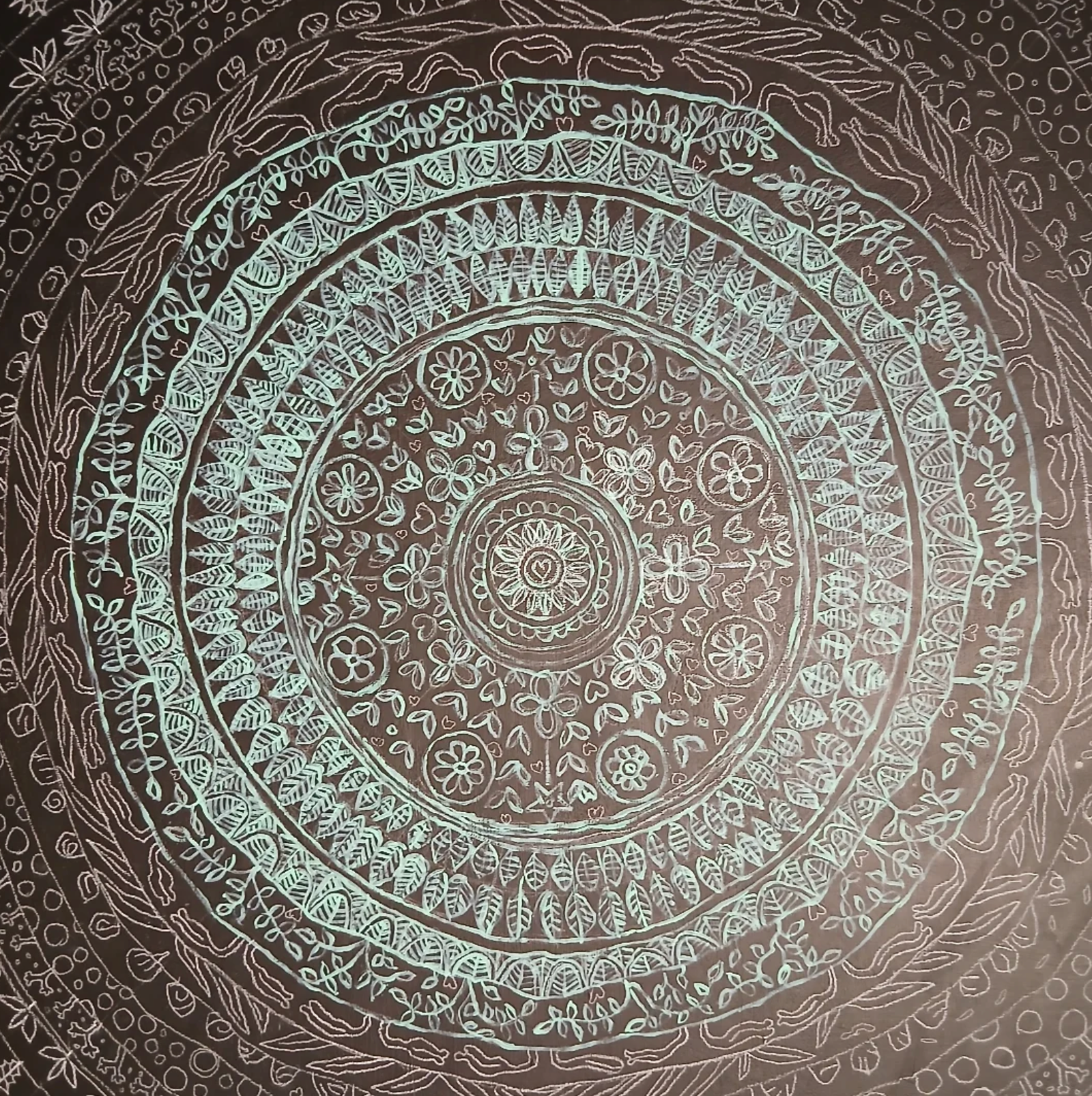 For Andrew, painting is more than technique — it’s a form of meditation. Each mandala begins with a structure, a rhythm, and a single brushstroke that gradually unfolds into a balanced whole. His process is patient and deliberate, built through repetition and intuition rather than planning or speed.